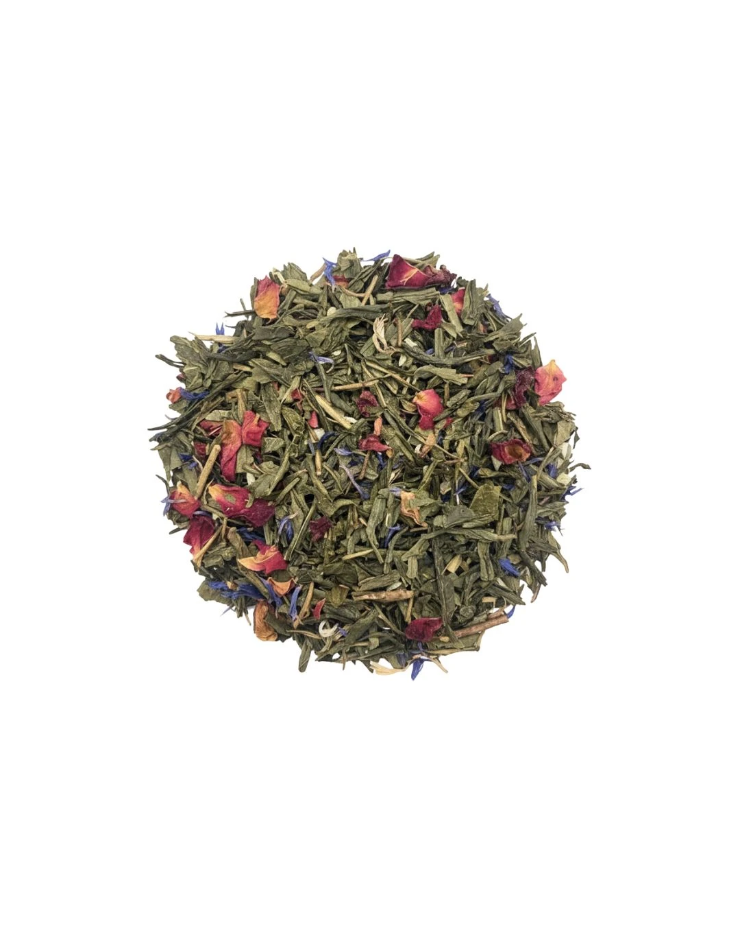 Thé vert, noix de coco rapée, arôme, pétales de rose, fleurs de souci.