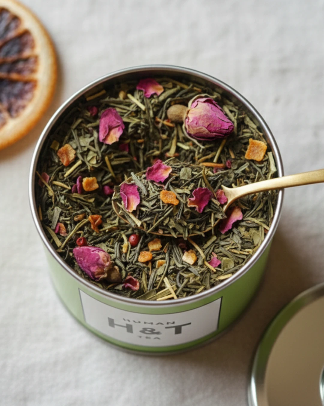 Un très bel assemblage de thé vert, cannelle, écorces d’orange, pétales et boutons de roses pour une tasse délicieusement épicée.