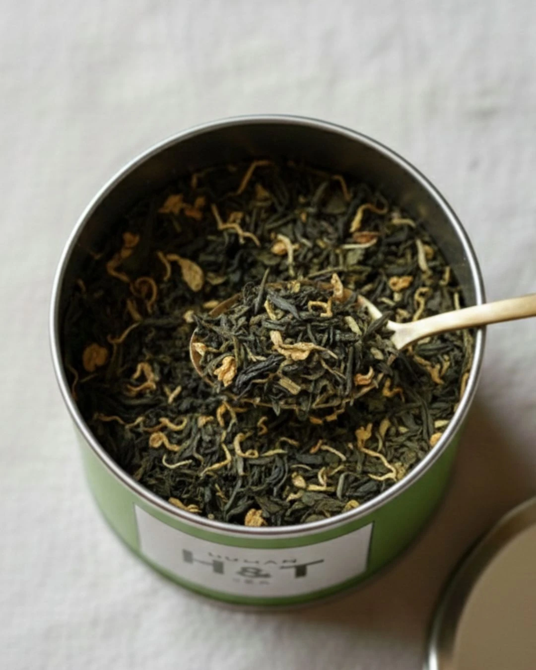 Thé vert au jasmin*, arôme naturel d'abricot, menthe poivrée