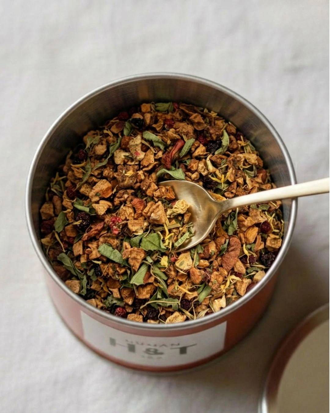 Pomme, arôme naturel, rooibos vert, orange, verveine, feuilles de murier, fleurs, cranberries, groseilles rouges et noires, framboises.