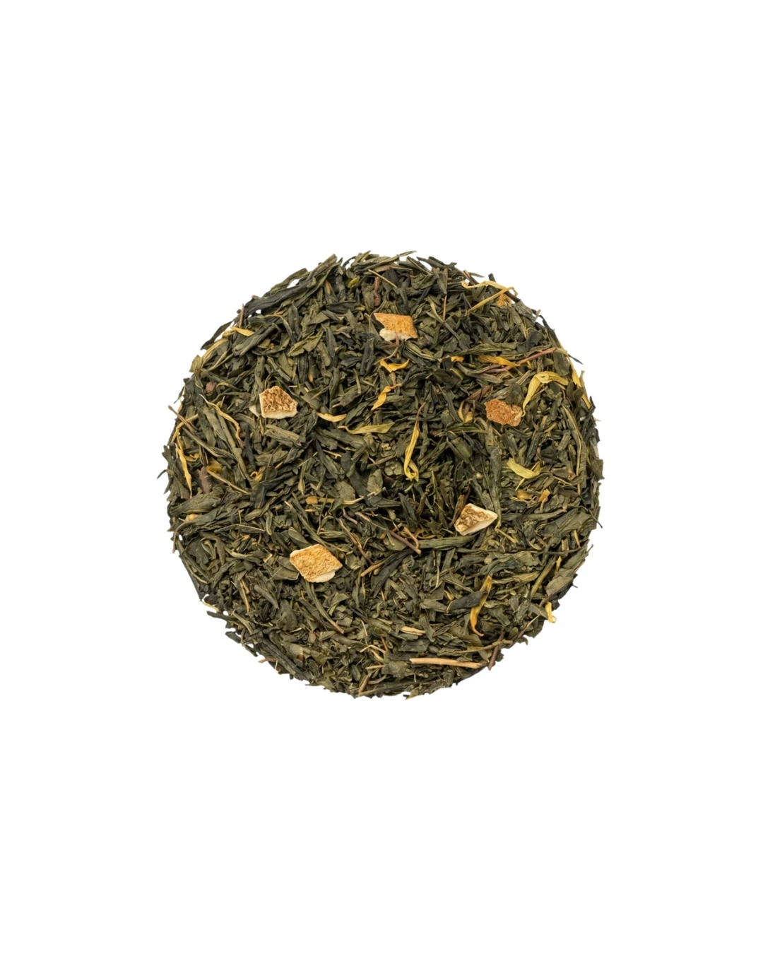 Thé vert*, écorces d‘orange*, arôme naturel, fleurs*
