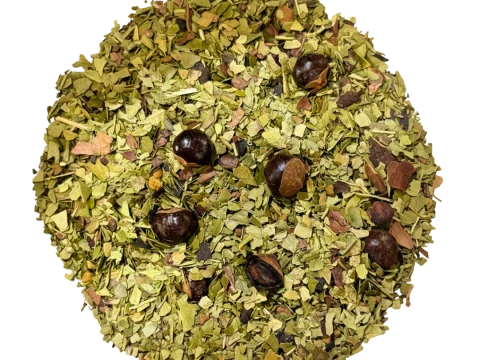 Maté, guarana, éclats de fèves de cacao, orange et miel