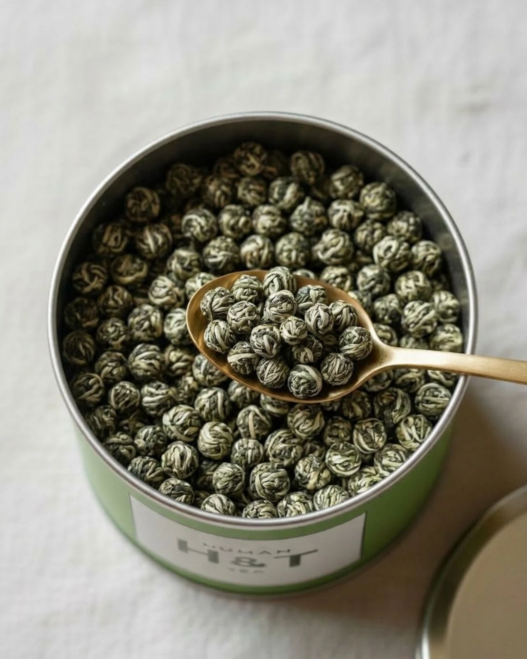 Sublime thé vert : Perles de Jasmin biologique, parfumé aux fleurs de jasmin et roulé en perles.