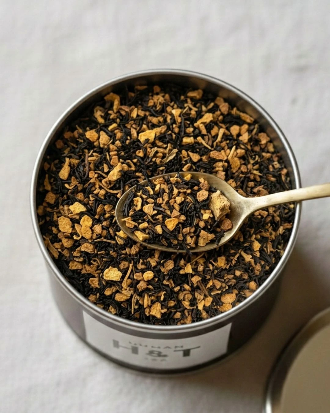 Thé noir*(33%), cannelle*, poivre rose*, gingembre*, clous de girofle*, cardamome*, Graine de chai*, éclats de fèves de cacao*, écorces d'orange*, fleurs*.