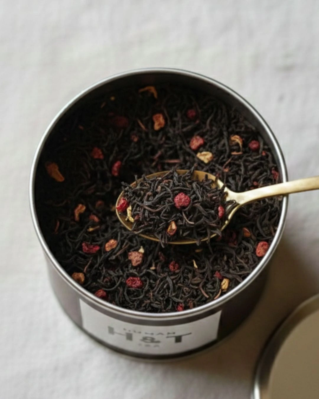 Thé fruité gourmand aux framboises et groseilles, un assemblage parfumé qui allie le caractère du thé noir à la fraicheur des fruits rouges.