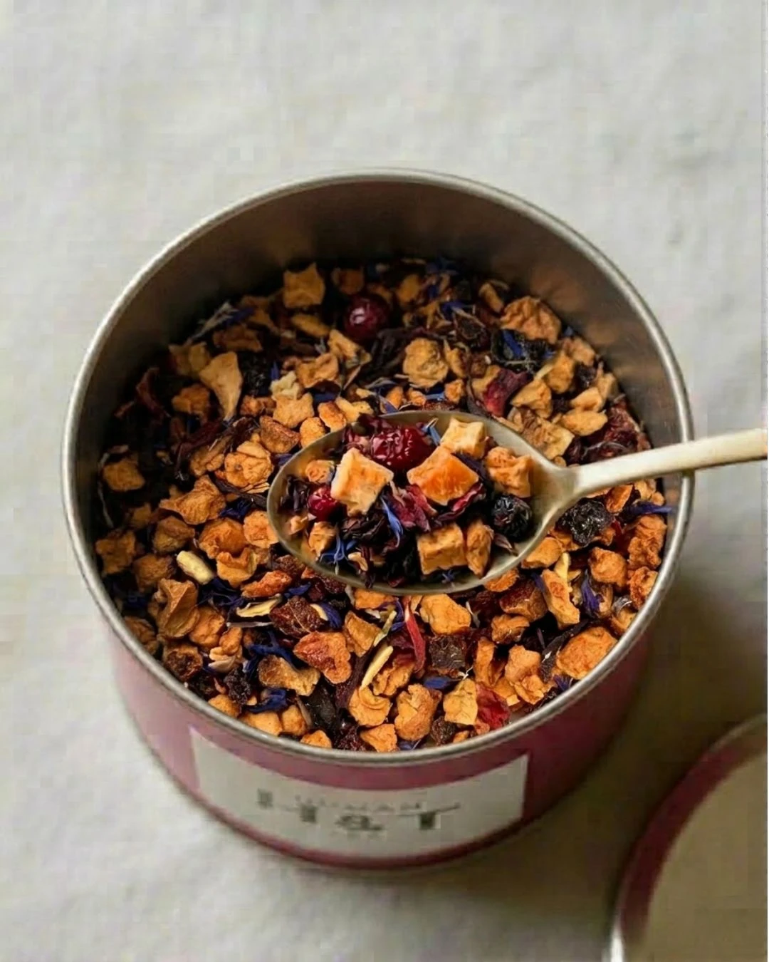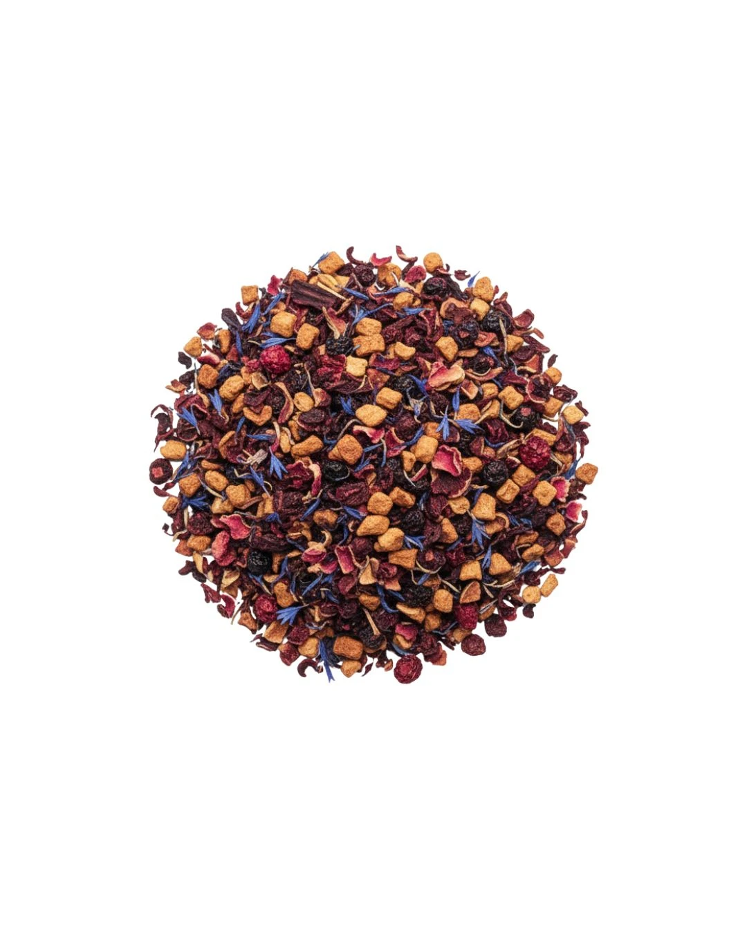 Pomme*, églantier*, hibiscus*, écorces d‘orange*, arôme naturel, huile essentielle de citron*, fleurs*